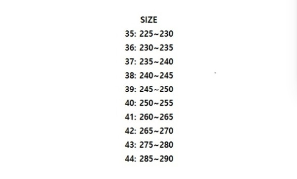 35(225~230),36(230~235),37(235~240),38(240~245),39(245~250),40(250~255),41(260~265),42(265~270),43(275~280),44(285~290)