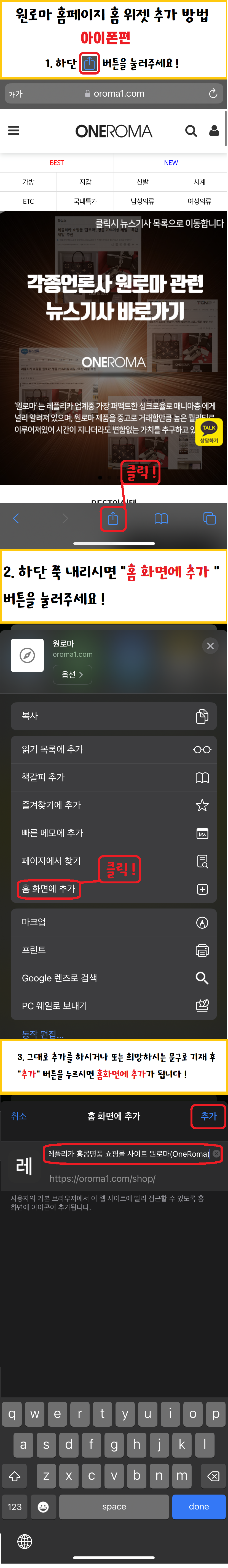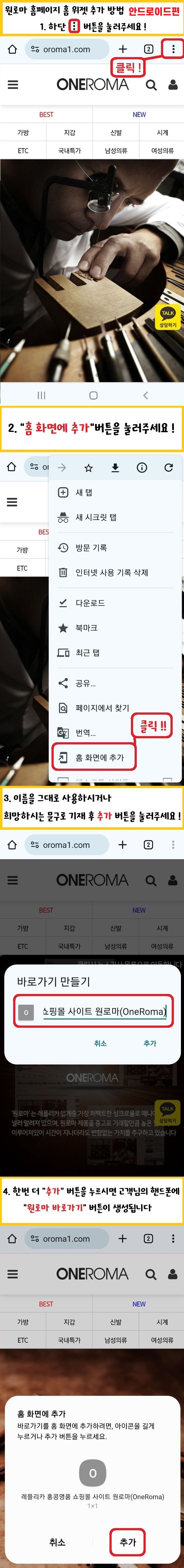●원로마 쇼핑몰 홈페이지 홈 화면 바로가기 만드는 방법● 페이지 정보 작성자 최고관리자 (61.♡.213.136) 작성일24-04-29 21:48 조회5,400회 댓글0건 관련링크 이전글 다음글 목록 글쓰기 본문 상단 사진은 안드로이드편 하단 사진은 아이폰편 댓글목록 등록된 댓글이 없습니다. 이전글 다음글 목록 글쓰기