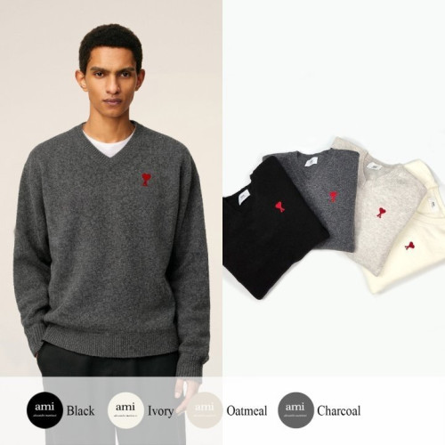• AMI 아미 드 꾀흐 엠브로이더리 V넥 울 스웨터