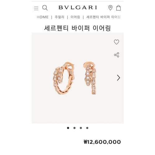 색상: 핑크골드 사이즈: 약2.0cm 구성: 정품 불가리 박스 + 본품 +쇼핑백.보증서 해외 국내 유명 셀럽이 착용한 불.가리 세르펜티 이어링 입니다. 디자인 자체가 명품 답게 쉽게 질리지 않고 데일리 정장. 언제든지 착용 코디 가능한 목걸이에요. 직수입 1:1 미러급 완제품 입니다. 땀이나 물에 쉽게 변형되지 않는 특수 도금 입니다